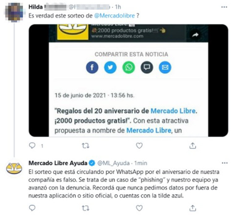 También circuló en WhatsApp una estafa que suplanta la identidad de Mercado Libre y busca convencer a potenciales víctimas de un sorteo de productos que fueron devueltos. Tras algunos pasos previos para reclamar el premio, la víctima debe enviar a sus contactos el supuesto sorteo: así la campaña logra en poco tiempo un alto alcance. Luego, la víctima es dirigida a un sitio que utiliza técnicas de ataques conocidos como scareware, para hacerle creer que su dispositivo está en peligro, y desplegar publicidad fraudulenta, recolectar datos o descargar malware.